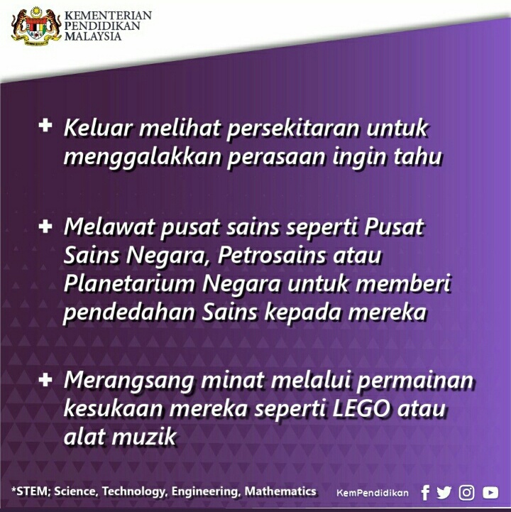 Dalam pada itu, ibu bapa juga boleh memberi pendedahan tentang STEM kepada anak mereka bermula dari rumah.